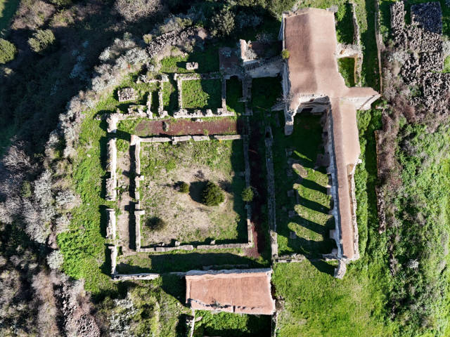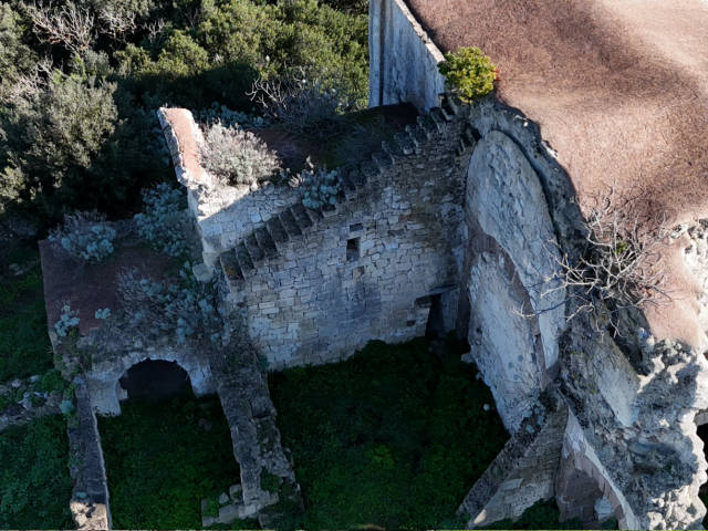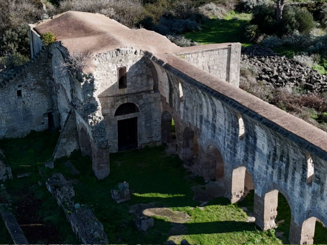 Davanti a te vedi ciò che resta di un complesso che per secoli è stato vivo. La chiesa, costruita in pietra calcarea locale, seguiva lo stile severo e misurato delle maestranze cistercensi attive in Sardegna tra XII e XIII secolo. Era una chiesa a croce commissa: tre navate scandite da arcate su pilastri, un transetto poco sporgente, cappelle laterali e un presbiterio quadrangolare. Gli spazi erano coperti da volte a botte, pensate per accogliere il silenzio e amplificarlo.