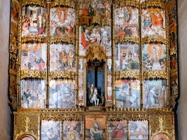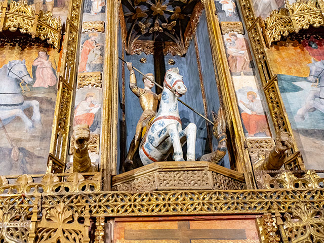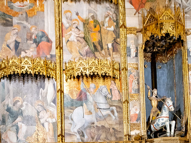 Entri nella chiesa di Santa Maria degli Angeli e ti sposti verso la cappella laterale. Lo spazio si restringe. Poi lo vedi. Il Retablo di San Giorgio ti sta davanti come una parete dipinta, alto più di otto metri, largo oltre sei. Cinquantadue tavole in legno, dipinte a olio nel XVI secolo, incorniciate da legno dorato che riflette la luce. Ti avvicini e l’occhio non sa dove fermarsi. Scene del Vangelo, santi, evangelisti. Al centro, dentro una nicchia sorprendente, una scultura lignea di San Giorgio trafigge il drago. Due avambracci scolpiti sporgono ai lati, reggono stendardi invisibili. Capisci che non è solo arte. È una macchina narrativa pensata per colpire, insegnare, restare. Attorno, il museo diocesano completa il racconto con argenti, oreficerie e sculture lignee di epoche diverse. Ma è il retablo che comanda lo spazio. E lo sguardo.