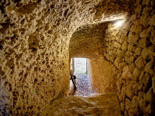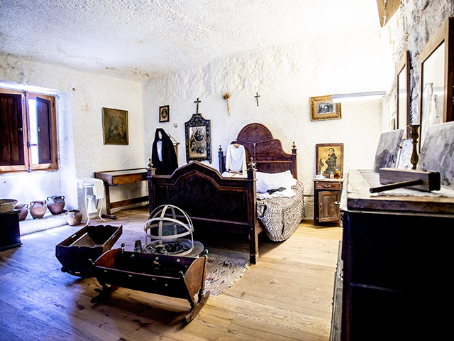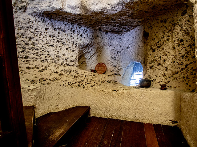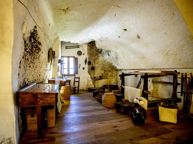 Entrandoci, inizi a scendere letteralmente dentro il tempo. Prima trovi gli ambienti più recenti: stanze medievali e ottocentesche collegate da scale e botole scavate nella roccia, dove il silenzio fa risuonare il passato. Oggi ospitano il Museo Etnografico dell’Anglona: circa 600 oggetti, utensili, telai, arredi e abiti che raccontano la vita agro-pastorale della comunità di Sedini dal Settecento in poi. Puoi osservare la camera da letto ricostruita, immaginare il lavoro nelle botteghe, scoprire il magazzino o gli ambienti che, nel XVI secolo, furono probabilmente carceri dell’inquisizione spagnola.