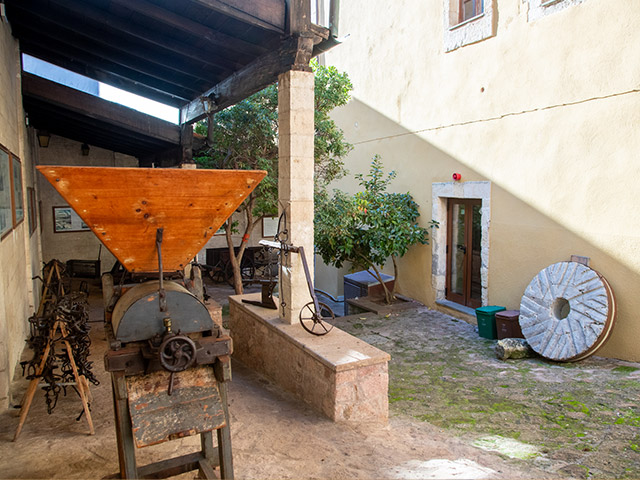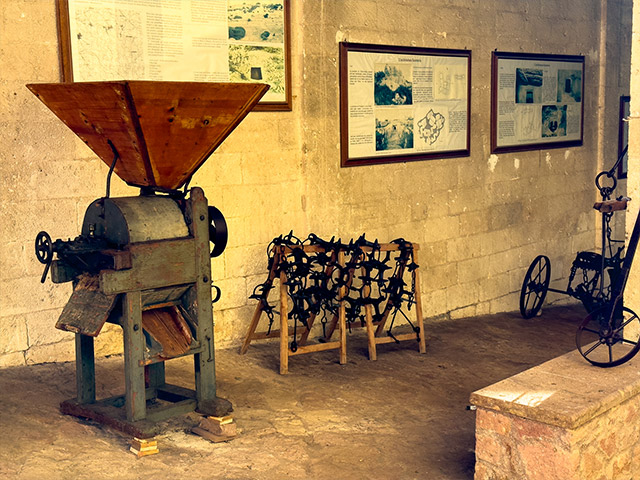 Varcata la soglia del Palazzo Baronale entri in una casa che racconta fatica e ingegno. Il percorso sale piano dopo piano. Al pianterreno cammini tra zappe, aratri, finimenti per animali da tiro, appoggiati lungo il corridoio che porta al cortile. In una stanza trovi pesi antichi, strumenti per fare il formaggio, il vino, l’olio. Oggetti usati ogni giorno. Al piano superiore le stanze prendono forma. La cucina, la camera da letto, gli unici spazi dell’abitazione contadina. Poi s’apposentu, dove si cuciva, si ricamava, si accoglieva. In un’altra sala il rumore cambia. Attrezzi da falegname, fabbro e calzolaio raccontano i mestieri più diffusi a Ossi. Al secondo piano la sezione archeologica chiude il percorso. Qui capisci come il paese riusciva a bastare a sé stesso.