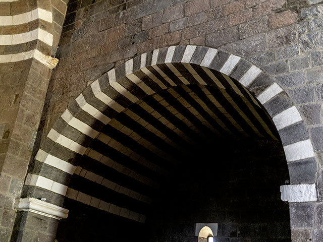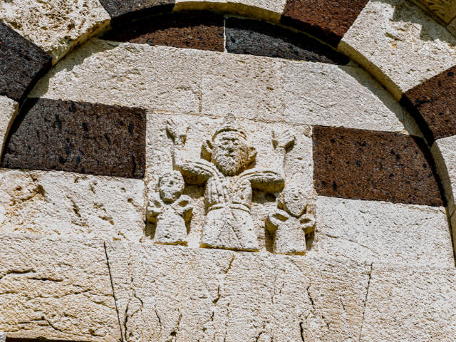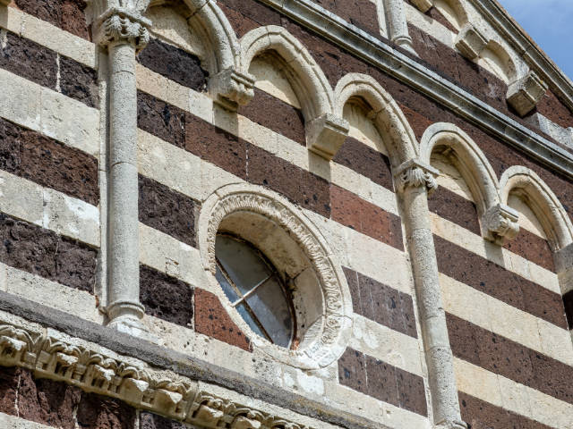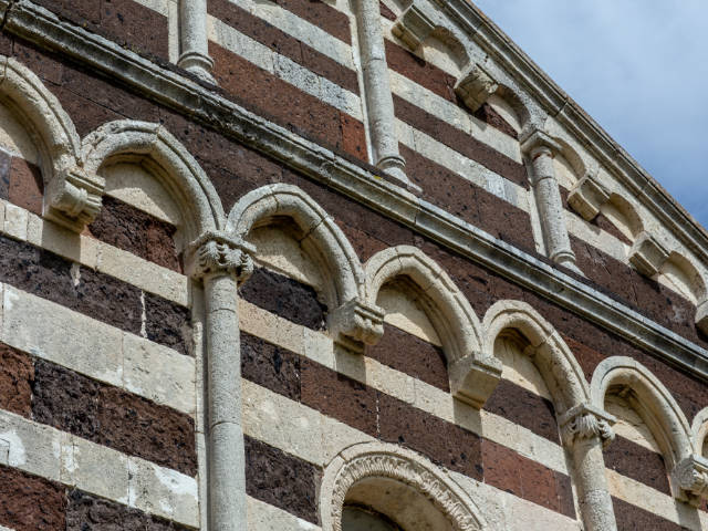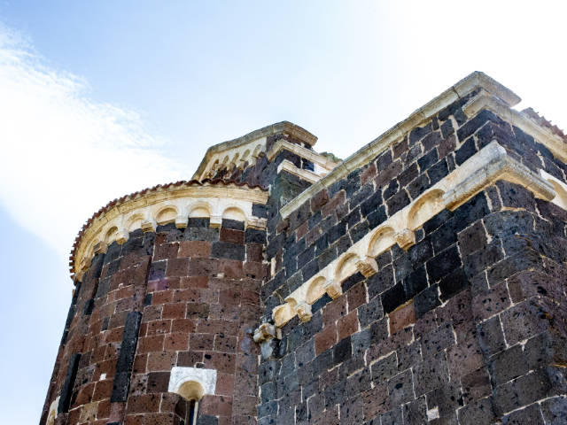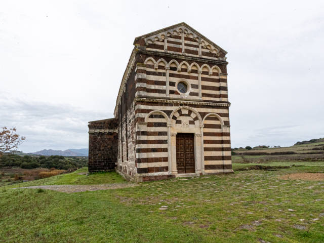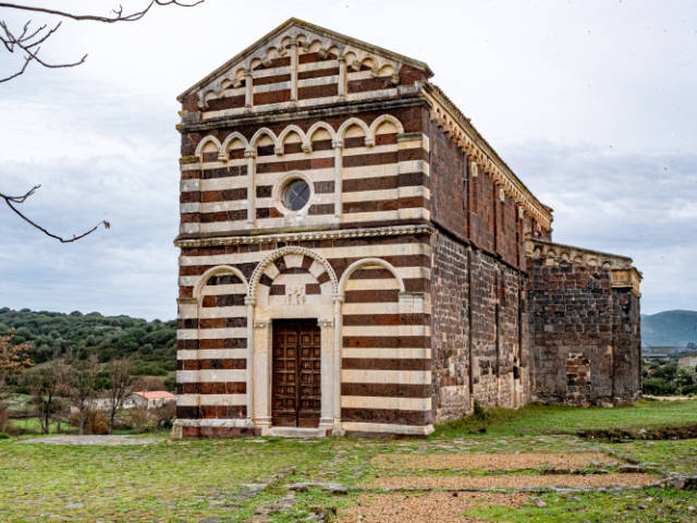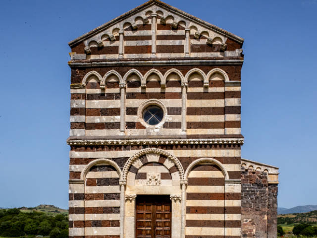 Davanti a te si presenta una delle massime espressioni del romanico-pisano in Sardegna. La facciata ti colpisce per la sua bicromia: la trachite scura e il calcare bianco disegnano tre ordini armoniosi, una geometria precisa che gioca con luce e ombra. Avvicinandoti al portale architravato, noti i capitelli a foglie, gli stipiti monolitici e la lunetta: un rilievo essenziale, quasi rude, con un personaggio in preghiera affiancato da due uomini barbuti. Un dettaglio che ti parla di fede, di gesti antichi, di mani che hanno scolpito la pietra con intenzione più che con ornamento.